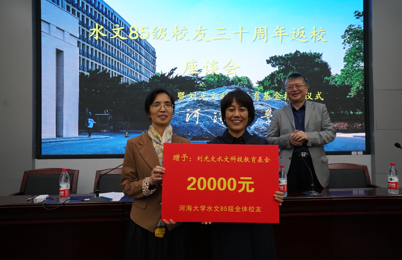校友们怀着对刘光文先生的敬仰和崇敬之情,给刘光文铜像敬献花篮,举行了刘光文水文科技教育基金的捐赠仪式,捐赠近2万元的经费用于水文事业的建设和发展。