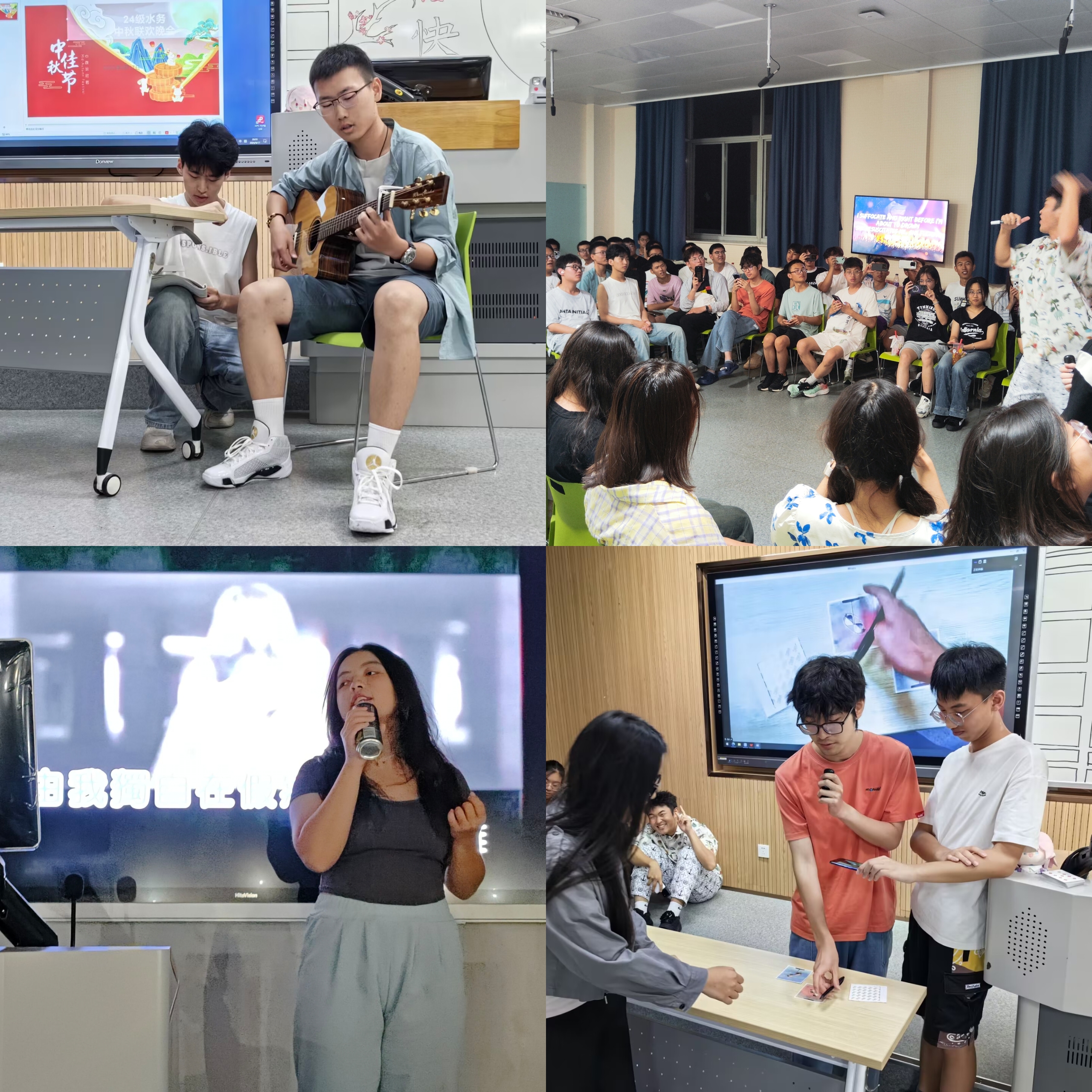 联欢会现场,同学们精心布置了会场,灯笼高挂,彩带飘扬,处处洋溢着节日的喜庆氛围。“猜灯谜、变魔术、诗词飞花令、你画我猜、歌曲串烧、民族舞蹈……”,各班同学纷纷拿出看家本领,为大家奉上了自己精心准备的节目,高年级助学导师也积极参与其中,与新生们同台献艺,赢得了现场观众的阵阵掌声和喝彩声。联欢会现场欢声笑语不断,洋溢着浓浓的中秋节日氛围。
