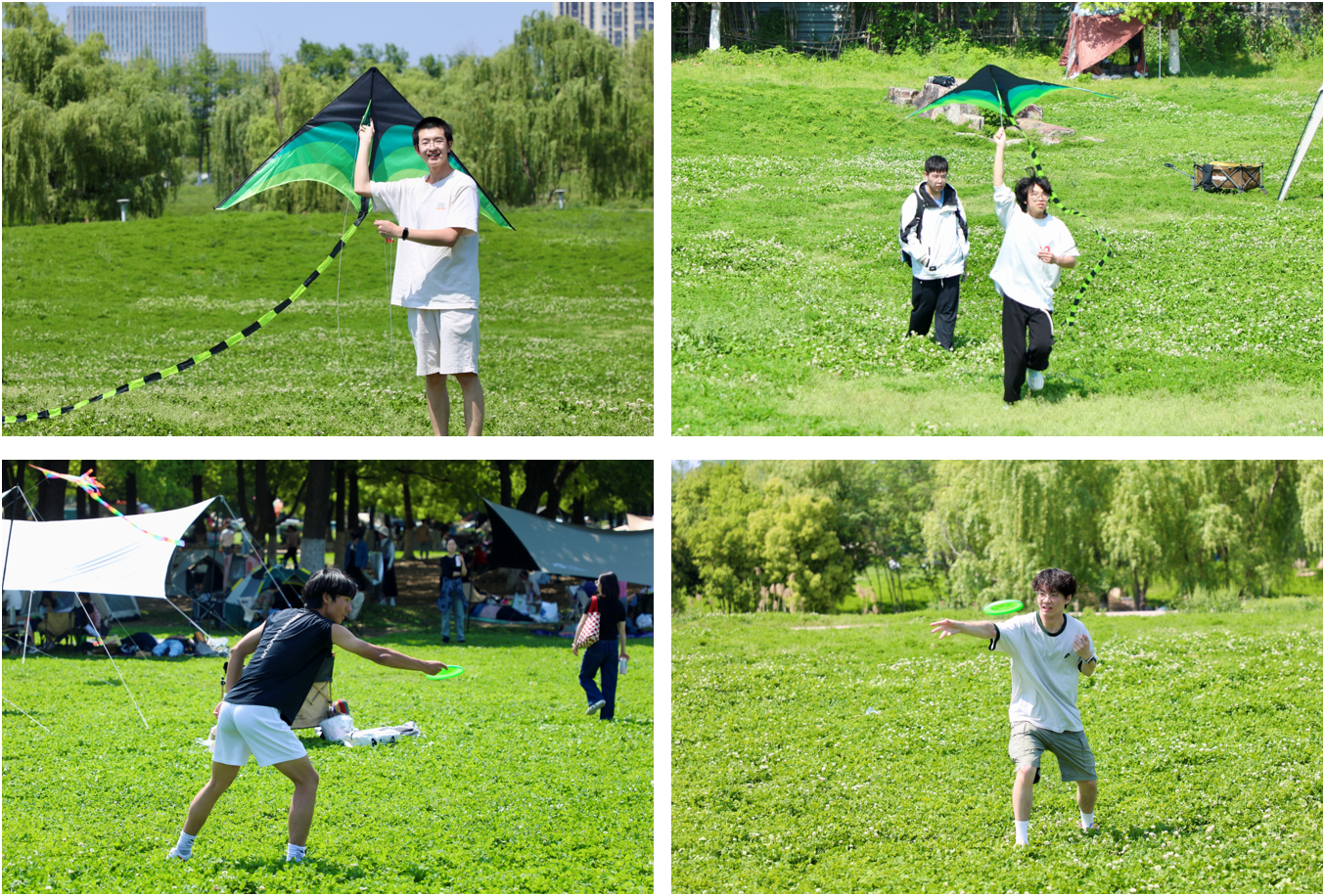 活动以户外休闲趣味项目为核心,兼顾参与性与趣味性,设置放风筝、飞盘运动、棋牌休闲、春日摄影等丰富环节。活动当天阳光和煦、清风宜人,其中放风筝区域氛围热烈,各式风筝次第升空,大家互相协助组装、配合牵引放飞,奔跑的身影与摇曳的风筝相映成趣,现场欢声笑语不断。飞盘项目同样备受欢迎,同学们在草坪上默契传接、尽情奔跑,在协作中展现青春活力。棋牌休闲与春日摄影环节为活动增添了轻松惬意的氛围:树荫下,大家围坐交流、切磋娱乐,在轻松互动中拉近彼此距离;湖畔边,同学们以湖光春色为景定格美好,记录春日限定的温暖瞬间。整场活动组织有序、氛围融洽,同学们在自然中舒缓压力,在相伴中增进情谊。